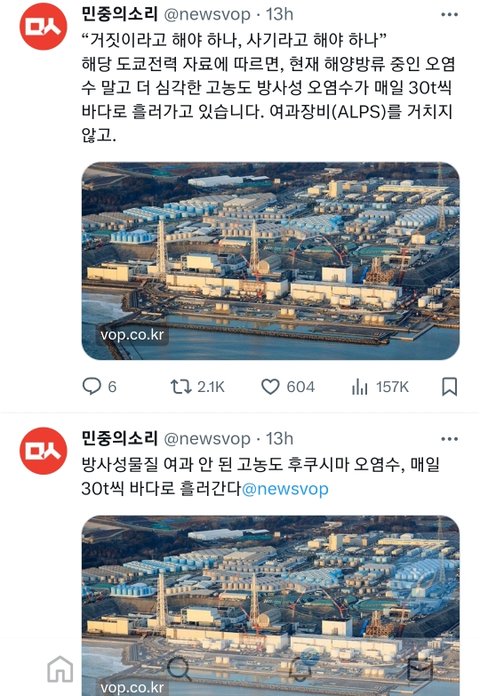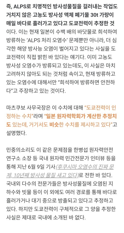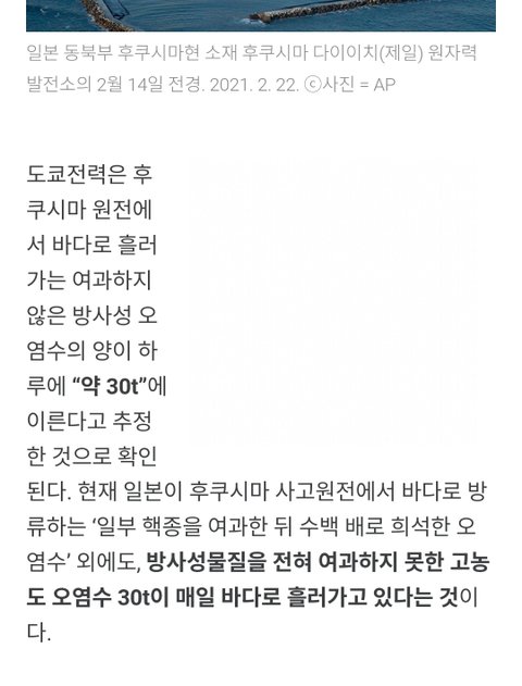 현재 해양방류 중인 오염수 외 고농도 방사성 오염수가 매일 30t씩 방류중