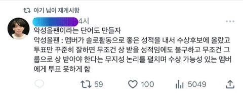 짹에 헛소리하는 사람 얼마나 많은데 단체에 투표하면 다같이 받는거니 투표해달라는 일개 작은 계정의 글이 알티타면서 "악성올팬"이라는 단어까지 생겨났는지 정말 이해가 1도 안됨