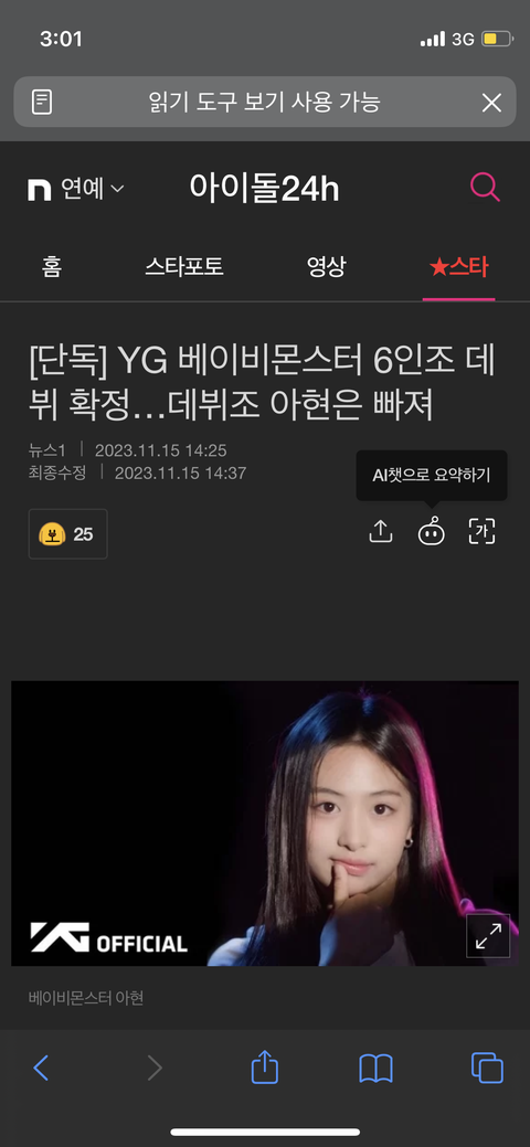 [특보] YG 새 걸그룹 베이비몬스터 '아현' 탈퇴
