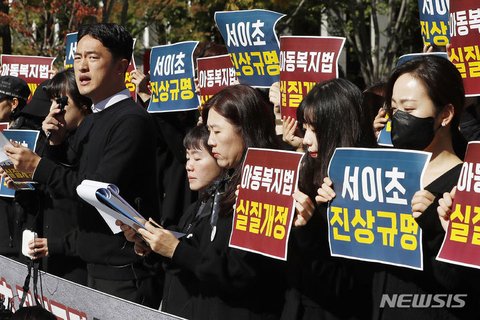 (사진2 설명) (서울=뉴시스) 최동준 기자 = 전국 교사들이 지난달 21일 서울 광화문 광장에서 서이초 진상 규명 및 아동복지법 개정 촉구 기자회견을 하고 있다. 2023.11.14. photocdj@newsis.com