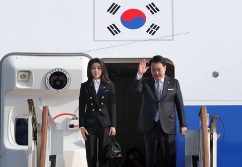 (사진3 설명) 아시아·태평양경제협력체(APEC) 정상회의 참석차 샌프란시스코로 순방을 떠나는 윤석열 대통령과 부인 김건희 여사가 15일 성남 서울공항에서 공군 1호기에 오르며 환영객들에게 손들어 인사하고 있다.