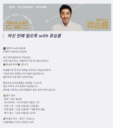 비티비가 11월 24일에 홍대 티 팩토리에서 류승룡 토크 콘서트 한다고 해서 지금 겁나 기대 중ㅋ