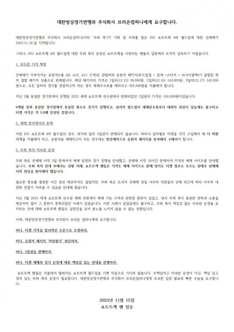 빙상연맹은 나라 세금으로 운영하는 연맹임 근데 팬심을 이용해서 저렇게 지들 주머니 채우는 건 너무 잘못됐다고 생각함