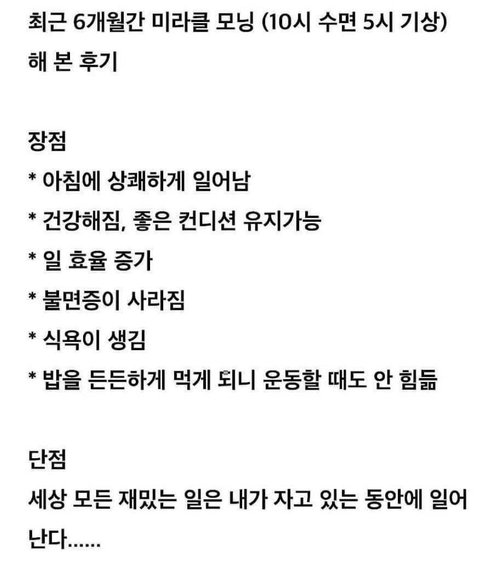 젊었을땐 열심히 일하고 배우고, 실력키우고, 연애도 하고.. 미라클 모닝같은건 일부러 하진 마. 그냥 출근할때 이불속에서 늑장 부리느라 습관처럼 늦어서 헉헉 대는 삶만 아니면 됨. 지금보다 딱 15분만 이불속에서 먼저 나와. 핸드폰 알람이 딱 두번째로 울리는 그 시간안에만 일어나는 습관만 들여도 성공하는거임. 쫌만 부지런떨고, 아침에 뭐라도 한입 먹고, 빠른걸음으로 되도록 대중교통 이용해서 체력과 인내력을 길러. 어차피 30대 중반 넘어 차사면 이럴 일도 점점 사라지고 살만찌고 배만 나오면서 저질 체력 되거든. 회사 가는길에 여기저기 주변도 잘 둘러봐. 세상이 어찌 돌아가는지, 상권이 어찌 변하고 있는지, 오디오북도 듣고.. 더도말고 덜도 말고 하루 1분씩만 앞당겨 지금보다 30분만 더 이른 기상을, 하다못해 15분만 해도, 여유로운 화장실보기도 가능하고 좀 더 맛있다는 까페에서 커피를 살수있고, 휴게실에서 뭐라도 먹으면서 여유를 가질수 있단다. 미라클 모닝? 그거 어차피 갱년기 지나면 저절로 돼. 점차 할 일도 적어지고, 걱정은 눈덩이처럼 불어나 잠은 안오고.. 예전처럼 잠자리하는 재미도 덜하고, 체력도 안돼 인맥도 좁아져, 심지어 조기 퇴사해서 일거리도 없어, 뭐라도 할라하니 다 돈이 드는데다 성공 보장은 2프로대. 자식들 키우느라 현금도 1억원 이내인데 큰애는 아직 취준생이면 식욕도 사라짐. 자식보다 부모가 더 애가 탐. 부모님은 늘 아프시다면서 관심가져달라하시고, 친구나 지인들은 하나같이 나보다 더 잘나가고 잘 사는것 같고.. 잠? 잠을 자지 않고도 살아지는 점점 미라클 모닝이 되어감. 노인들 봐라. 잘 주무신다는 분들이 얼마나 되는지. 젊을땐 진짜 하는일이, 해야하는 일이 많으니까 잘 자야해. 그러니 부지런한 습관만 들여. 그러다 보면 네 인생자체가 미라클이 될거야.