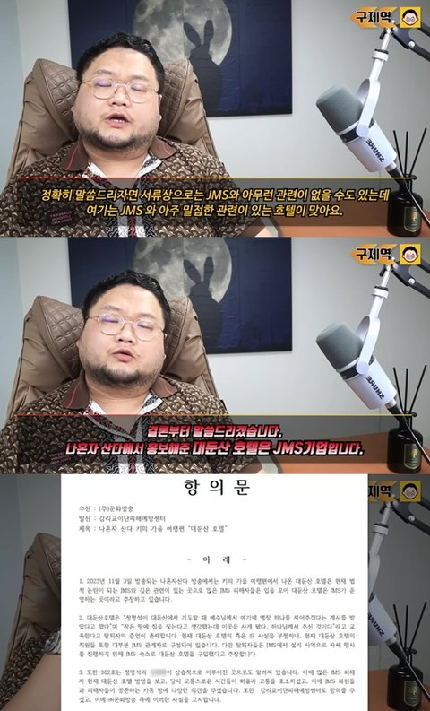 구제역은 "('나혼산' 방송이) 무료 PPL인지, 유료 PPL인지는 잘 모르겠다. 근데 무료이면 (제작진에)진짜 JMS 신도가 있는 거 아닌가 의심 할 만한 상황"이라며 실제 감리교 이단 피해 예방센터에서 MBC에 보낸 항의문을 공개했다.