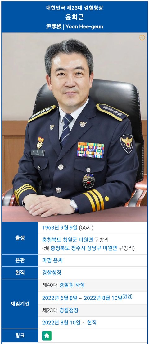 (사진2 설명) 윤희근(尹熙根, Yoon Hee-geun, 치안총감(★★★★)) 경찰청장 <출처 : 네이버 나무위키>