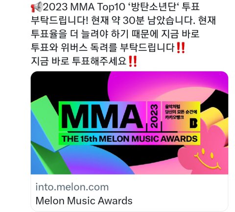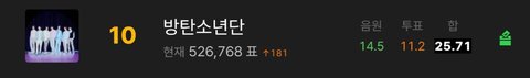 원래 예측 9위였는데 얼마 전에 10위 됨 11위 이하 순위에 멜뮤 참가하는 팀이 있어서 9위여야 안정권인데ㅠㅠ 아직 안 한 사람 있으면 방탄에 투표하고 오고 한 사람은 위버스에 독려 하고 오자