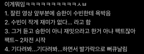 걍 승한이 계속 수빈한테 꼽주고 수빈은 대응도 못하고 ㅃㅋ 날린거 같은데 앞에 잘 들어보면 승한이 수빈한테 아니 재밌으라고 한 말 아니야 ㅋㅋㅋ 이러면서 깜 그러면서 그 와중에 승한이 뮤뱅가서 ㅇㅊ나 만나고~이거같은데 솔직히 걍 보기엔 승한이 수빈한테 ㅈㄴ 꼽줘서 수빈이 말못하는 걍 학창시절 전형적인 서열있는 남자애들 같음 어쩌다 둘이 사귀고 뭐 팬들을 무시하고 그런거 까지 나오는거임?