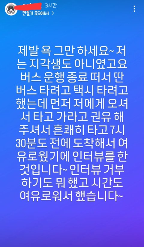 7시30분에 도착했었고 원래 택시타려 했었는데 먼저 오토바이 타라고 권유 받았던거래.. 지각도 아니어서 인터뷰 했던거고. 본인 욕하는거 다 봤나본데 그만하는게..ㅠ