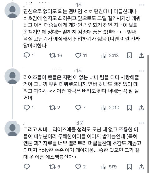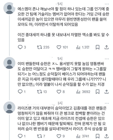 트위터 공계에선 병크 언급 안 하는 분위기에 판에서도 라이즈 올팬기조다 하길래 나도 공계에선 홍승한 싫단 얘기 안 하고 그냥 품는 멤 얘기만 했었는데 이젠 진심 걍 나갔음 좋겠어 키스짤 때문에 정이 안 가는걸 떠나서 그냥 개개개개개싫어 내 최애랑 대화하는 모습도 싫고 그냥 내 최애랑 한 화면에 잡히는것도 싫어..