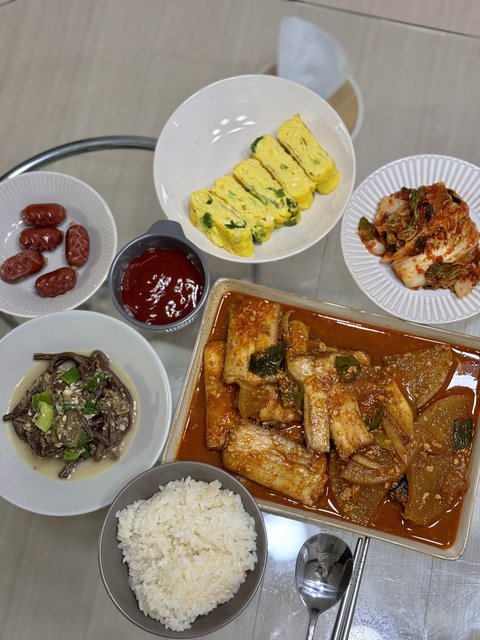 3) 갈치조림&고사리나물볶음▶갈치조림 양념장 ( 고추장1, 된장0.5, 고춧가루1, 진간장2, 멸치액젓1, 맛술2, 설탕0.5, 다진마늘1, 다진생강0.3, 후춧가루 톡톡)먼저 냄비에 무를 깔고 육수를 450ml정도 넣고 끓여요~ 저는 멸치다시마육수를 사용했어요!무가 익으면 갈치를 넣고 양념장을 넣어 자글자글 끓여주시면 됩니당마지막에 대파와 청양고추 올려서 조금 더 끓인후 완성!