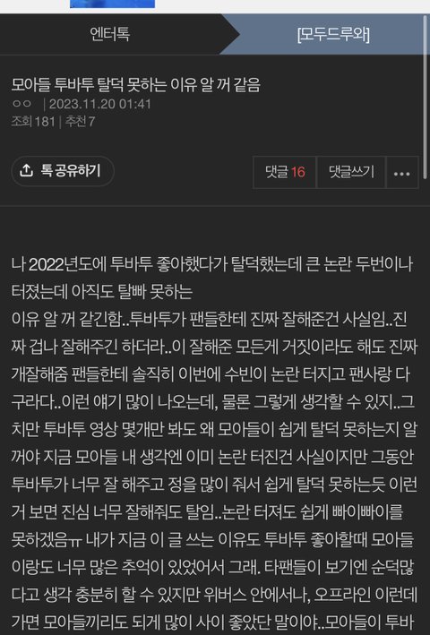 나도 저 글 너무 힐링되고 소중한데.. 어그로 끌릴까봐 팬톡으로 왔어ㅠ