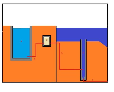 바다로 배출하면서, 염분차 발전도 하는거지. 농도가 높은 물이 F배관을 통해,