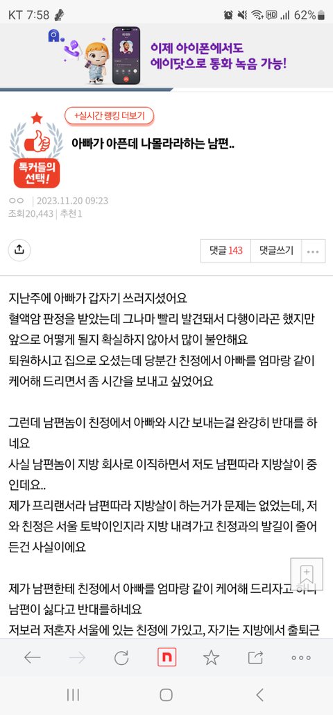[원본지킴이]아빠가 아픈데 나몰라라 하는 남편