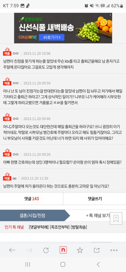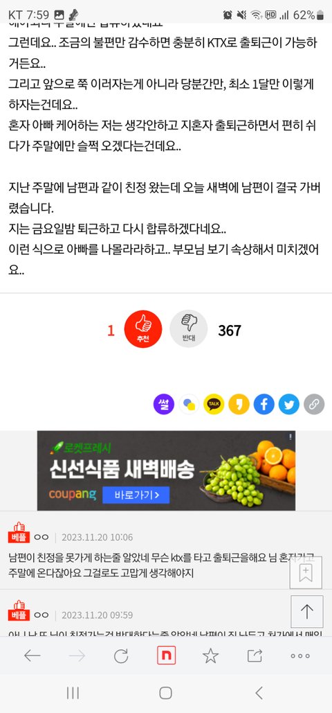 이럴 줄 알았음....남편이 친정가는 걸 반대하지도 않고 주말에 같이 다니는데 KTX타고 왕복하라니...진짜 무슨 생각임?