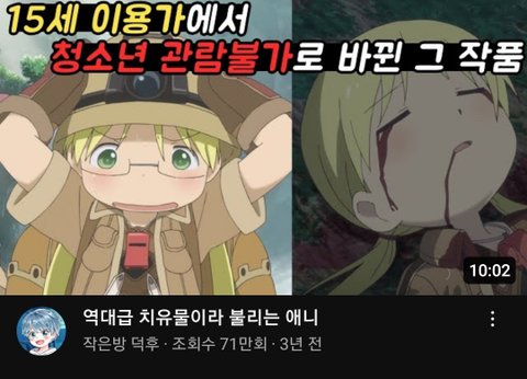 유튜브에 메이드인어비스 검색해도 잔혹하고 어지러운 썸네일로 추천하는 영상 몇십만 조회수 우르르 나옴