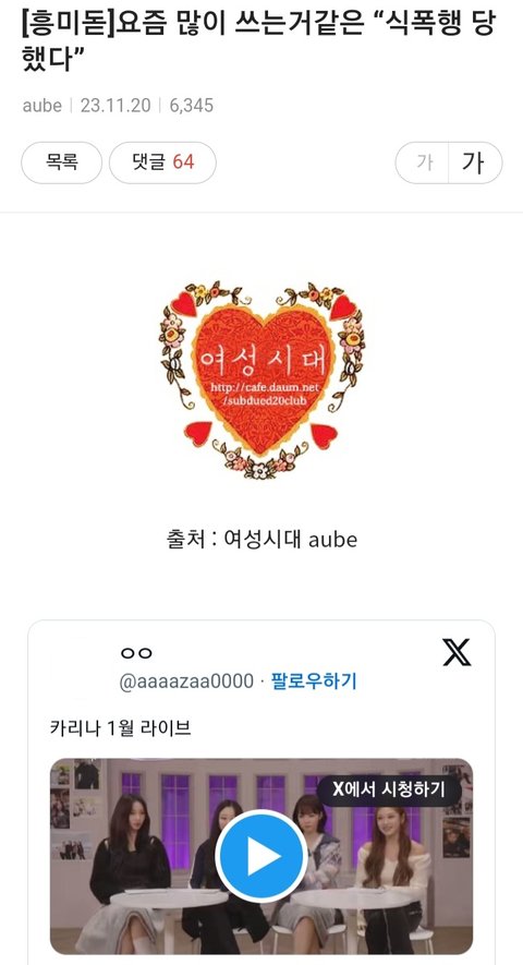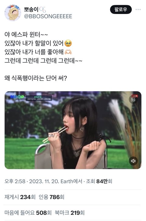 저 글 인용 보니까 카리나도 올해초 라방에서 윈터랑 똑같은 발언 해서 둘다 까이고 있더라 말하는거 깬다고.. 근데 댓글에 욕만 있는건 아니고 다음부턴 조심하면 된다는 의견도 꽤 많음ㅇㅇ 저 단어 어감이 좀 별로라 처음 들어본 사람은 거부감들수있는데 시초는 먹방 비제이들한테서 나온거라 막 그렇게 심각한 음지 단어는 아님 인스타 태그 검색해보면 쓰는 머글들도 꽤 있고.. 물론 의견이 갈리는 단어인건 맞아서 사용하지않는게 베스트긴함 담부턴 조심하겠지