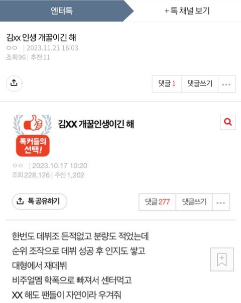 진짜 열폭러들 이것도 비추 테러ㅋㅋㅋ 여성 인권 타령하면서 잘난 애들한테는 심술 부림
