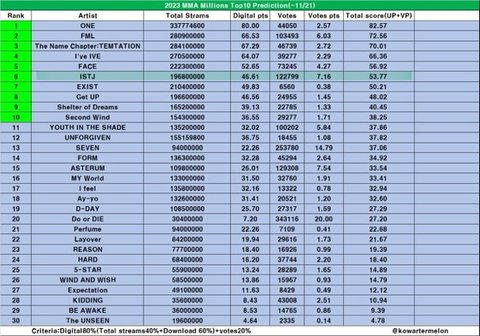 밀리언스 탑텐! 음원점수는 확정인지 지금도 누적되고 있는 건지 모르겠다 더 안정권으로 가보자고오