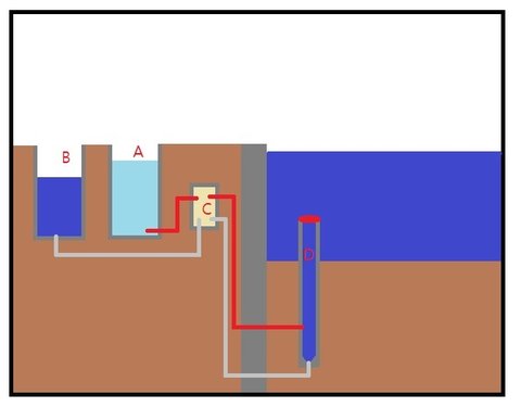 고농축 해수를 B에 저장하면서 사이펀의 원리에 따라서, 자연 압력으로 체워넣는거지.