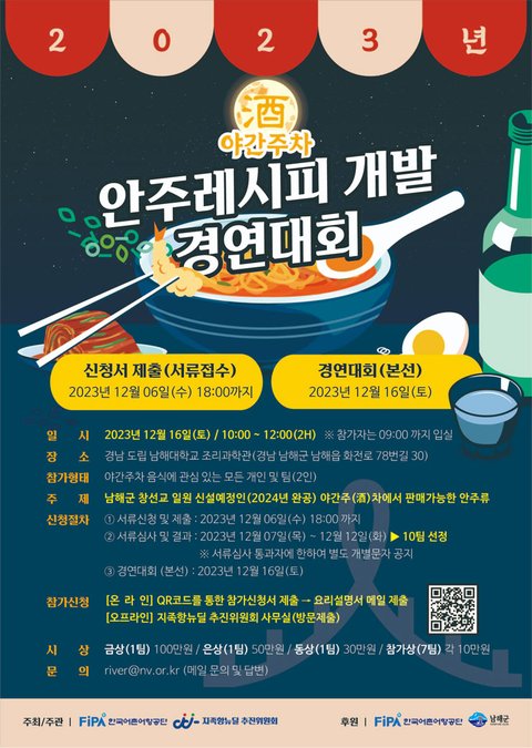 ■ 시상규모: 총 250만원- 금상 : 100만원 / 1팀- 은상 : 50만원 / 1팀- 동상 : 30만원 / 1팀- 참가상 : 10만원 / 7팀※ 소득세법에 따라 전체상금에서 제세공과금은 공제 후 지급됨※ 본경연대회를 통하여 당선된 레시피는 야간주(酒)차 운영주체인 지족항뉴딜(주)로 귀속됨