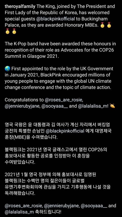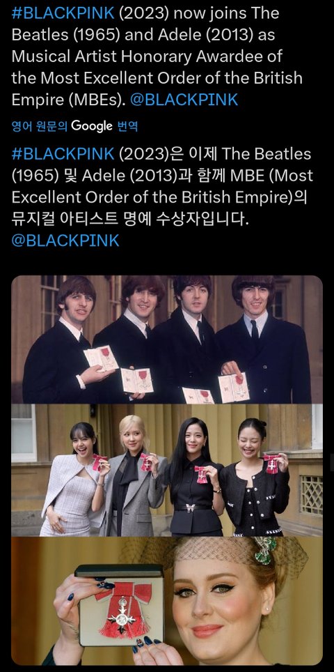 + 대영제국 MBE 훈장 블핑이 비틀즈&아델 다음으로 받는 거라고함 ㄷㄷ 비영국인 아티스트로는 최초래