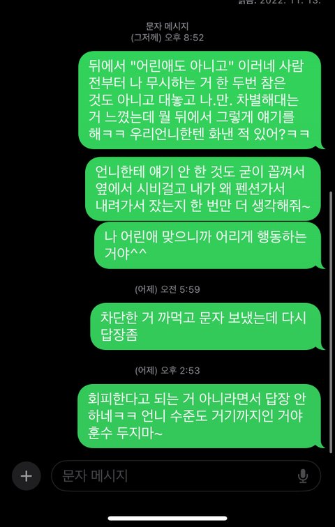 이렇게 화내면서 문자를 보냈어 물론 여기선 내가 급발진을 한 게 맞는데 10년 넘게 그 언니한테 괴롭힘 당하며 살아왔던 게 쌓이고 쌓여서 감정이 격해졌던 것 같아 그래도 회피하지말고 앞에서 말하라길래 문자로 화난 거 얘기하니까 또 삔또 상했는지 다 차단 박았더라고 그리곤 뒤에선 모든 사촌들 끌어모아 나만 이상한 사람 버릇없는 사람 만들더라고 그 언니가 큰이모 딸인데 큰이모 상메도
