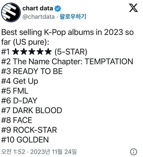 이게 순위야 순수 실물 앨범 판매량이고 아래 정국 끌고오는거 정국팬 같은데 스키즈가 정국보다 일주일 늦게 나왔는데 9위안에 잡힌거고 정국은 10위래