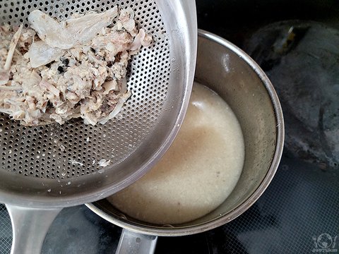 그동안 냉동실에 모아두었던 생선뼈를 푹푹 끓이고 한 번 걸러내면 뼈에 붙어있던 살점은 다 흩어져서 국물에 녹아듭니다.