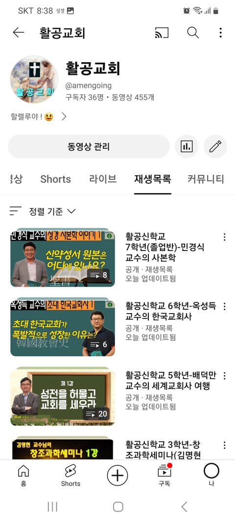 나열된 목록(홈 동영상 shorts 라이브 재생목록...) 중 재생목록을 터치 합니다
