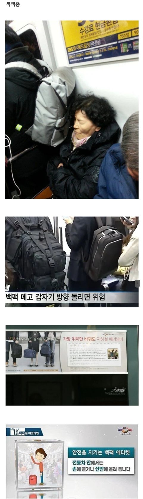 부피도 부피지만 가방을 앞으로 매면 자기가 그 가방으로 누구를 치거나 불편을 주지 않게 행동할 수 있잖아요. 뒤로 매면 안보이고, 느낌도 없으니 그냥 방향 휙휙 바꿔가며 사방으로 사람을 치고 밀고 다니게 되겠죠.