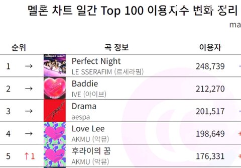 멜론 일간 순위 르세라핌 게임 콜라보곡 1위, 에스파 정식 타이틀 3위