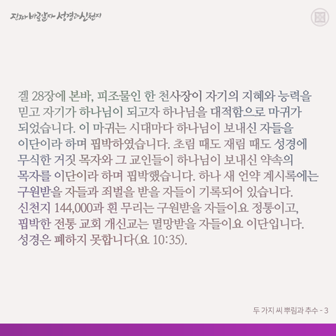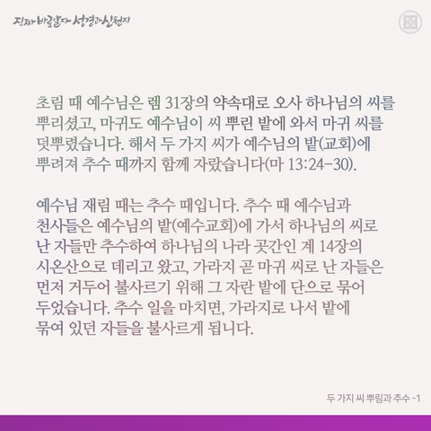 원수 마귀가 예수님이 씨 뿌린 밭(예수교회)에 가라지를 덧 뿌려 함께 자라게 되었죠