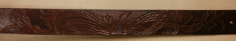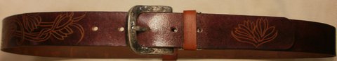 가죽에 카빙하고 버건디 컬러로 천연 염색하여 제작한 천연 가죽 벨트입니다.(마디샤가죽공예)