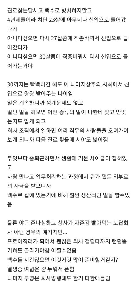 시험준비한다거나 자격증 딴다고 차일피일 취업 미루다보면 어느 순간 30대중반됨. 그때 정신차리고 진로 정한다해도 이미 백수생활 만성화되서 쉽지가 않음. 내주변 30대 후반 백수도 수두룩임.