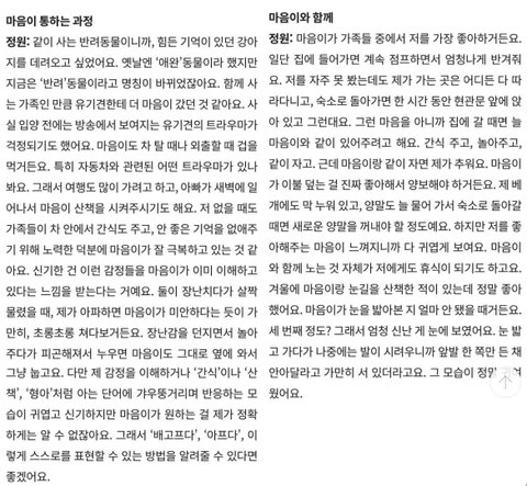 게다가 마음이는 처음에 눈물자국도 심하고 상태도 많이 안 좋았는데 정원이네 사랑 듬뿍받고 많이 좋아졌다고 함