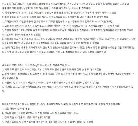 2. 전체 직원이 150명정도인데, 그중에 41명이 해고됨 -이쪽 회사는 정직원이 매우 적고, 문제 생겼거나 생길만해서 해고당한 애들은 다 계약직이라고 함