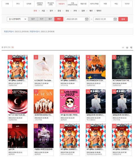 2022~2023년 국내에서 열린 대중음악 공연(콘서트) 연간 티켓판매액 랭킹