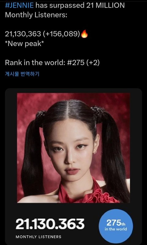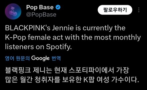 스포티 월간 청취자수 2100만명 넘은 케이팝 솔로가수 리사&정국&제니뿐이라고
