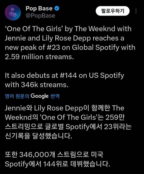 제니&더 위켄드&릴리로즈뎁 오스트 스포티에서 역주행하는 중 어제 미국 스포티도 진입함 (유앤미 발매하면서 스포티 같이 진입하더니 버프 받고 꾸준히 역주행 중) (현재 틱톡 편집 영상으로도 쓰이면서 계속 상승세임)