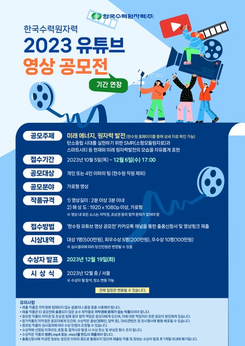 ○ 응모자격 공모대상 : 개인 또는 4인 이하의 팀(한수원 직원 제외) ○ 공모전 마감일 12월 6일(수) 17:00 ○ 시상 내역 대상 1명(500만원), 최우수상 5명(200만원), 우수상 10명(100만원) ○ 응모 일정 2023년 10월 5일(목) ~ 12월 6일(수) 17:00 ○ 제출/접수 방법 '한수원 유튜브 영상 공모전' 전용 카카오톡 채널을 통한 출품신청서 및 영상링크 제출