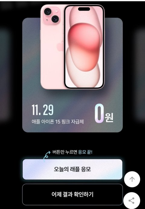 걍__구라같음 어디서도 당첨됐다는 안 나옴 걍 맨날 미당첨됐다고 그러지ㅋㅋㅋ 엊그제는 샤넬부츠고 어제는 아이패드고 오늘은 아이폰인데 아.무.도 당첨됏다고 후기 올리지도 않음 ㅋ
