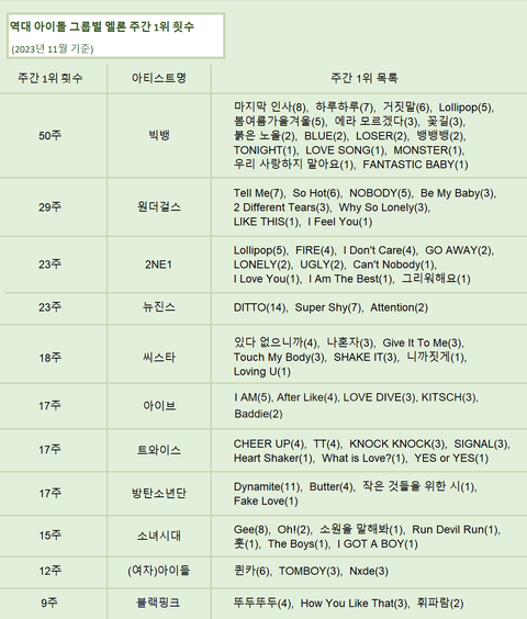 빅뱅 원더걸스 2ne1 뉴진스 씨스타 아이브 트와이스 방탄소년단 소녀시대 (여자)아이들 블랙핑크