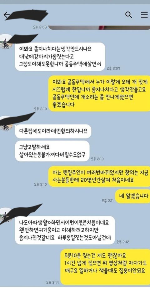그동안 무수히 메모로 개짖는 소리에 대한 피해를 호소해왔고 강아지전용 유치원이나 펫시터등 이용할수 있는 방편을 알려드렸음에도 노견이란 이유로 아무것도 하지않는 뻔뻔함은 절대 참을수 없습니다.