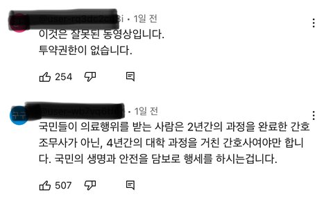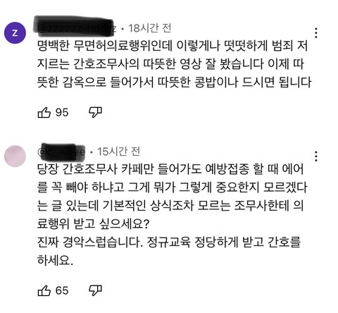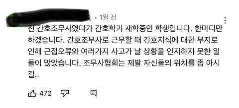 실제 간조출신이었다가 간호대 재학중인 사람이 쓴 댓글도 있고 간조분들도 왜 멀쩡히 일하는 자기들 욕먹게 만드냐며 간호사, 간조 모두 협회 영상 비난하는중임