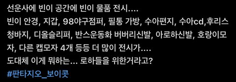 +계속 올라오는 트위터들을 보니까 소속사 사람들도 별로 이 일을 바라지는 않았던것 같더라고요. “이걸 언제 치워”라고 했다고 합니다. 추모공간을 만들어달라 한 적도 없는데 본인들의 사업을 위해 이용한거면서 팬들에게 계속 상처 줘야하나요?
