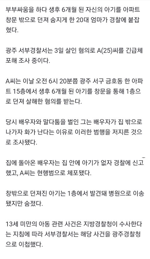 저거 뉴스 보면 맨날 싸우는 소리 살려달라는 소리 들리고 사흘 전엔가 여자가 가정폭력으로 신고도 했다고 함 여자 어린나이에 쓰레기 만나서 가정폭력╋산후우울 조합이라 저런 결과가 나온듯.. 산후우울증 쉽게 생각하는 것 같은데 심하면 산후우울증 하나만으로도 애 던져버리고싶은 충동 들기도 함 하물며 가정폭력까지 당하는 여자는 어떻겠음