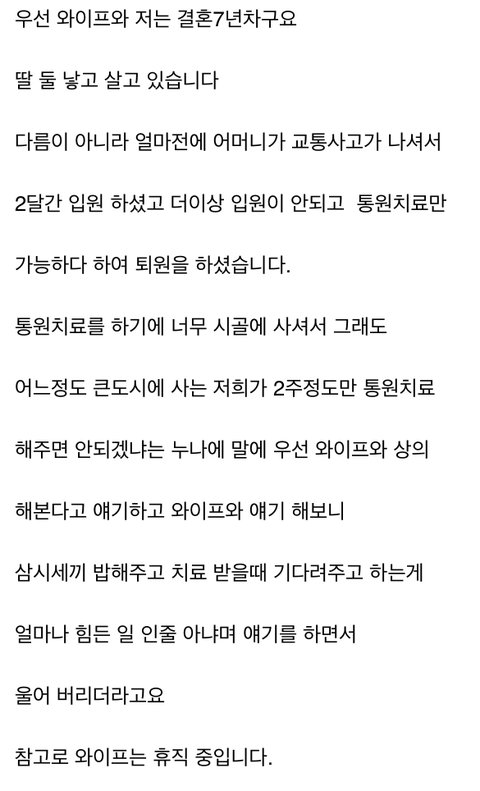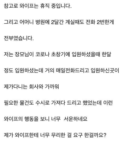 코로나 입원환자는 면회불가 시절이었으니 해봤자 병원 스테이션에 몇번 필요물품 가져갔겠지. 마치 가까운 병원이라 틈틈이 들여다봤다는 식.. 전화 매일하는거야 조금 신경쓰면 할 수 있는 일이고. 결혼 7년차니 맏아이가 커봤자 7살이고, 작은 애는 미취학인데, 아기 둘 건사하면서 시모 삼시세끼 차려내며 병원통원까지 시키는것과 전화 매일한통, 병원에 어쩌다 필요품 배달하는게 같다고 생각하나? 하려면 할 수 있음. 시모님이 존중하고 아껴주고 사랑해줬다면 하지 말래도 하지요.