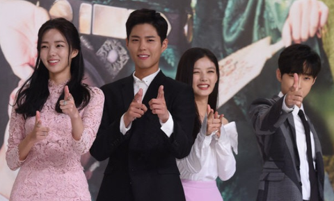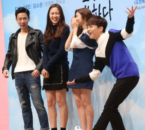 배우들은 두 손으로 하트 모양 포즈 취하는데
