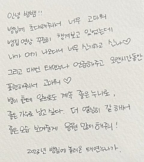 뱀집 성사 후 태연도 촬영날 편지를 써옴